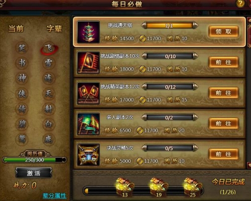 通过完成每日任务可获得阅历值,提高武林辈分,获得额外属性加成。