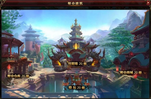 帮会建立初期,并没有建筑物的存在。帮会建筑是随着帮会等级提升,消耗帮会财富而建设的。帮会建筑主要有:帮会仓库、帮会商城、祭坛、技能塔。
