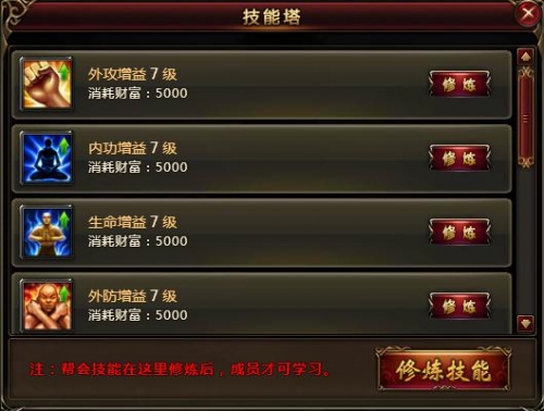 技能塔:侠士可以在这里学到更多的技能,完善自身的武学修为,便于闯荡江湖行侠仗义。学习技能也需消耗一定的帮贡。帮会技能学帮主在技能塔修炼之后,成员方可修炼。