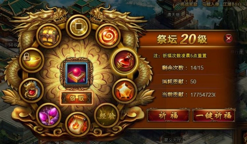 祭坛:帮会成员用来每日祈福祭祀的建筑。加入帮会的侠士们每日可在帮派祭坛祈福,以获得各种随机道具。祈福每日上限为15次。每次消耗50点帮贡。