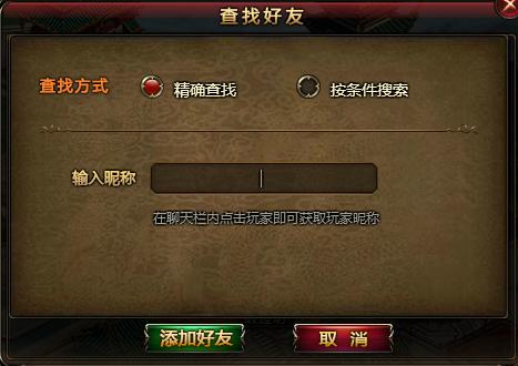 侠士可以通过查找功能进行查找好友,主要是通过”精确查找“或”按条件查找“进行添加好友。