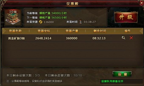 议事殿是山庄的标志性建筑,等级影响其他可升级建筑的等级上限。