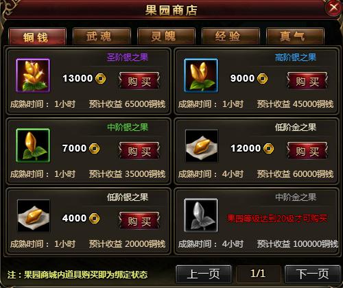 侠士可以点击进入“果园商店”,可以购买种子。种子主要有四种:铜钱、武魂、灵魄、经验。每种种子由低到高又分为四种品阶:低阶、中阶、高阶、圣阶。种子的颜色依次为白色、绿色、蓝色、紫色。品阶越高,种植所得的收益越大。打开“果园仓库”,可查看已购买的种子。