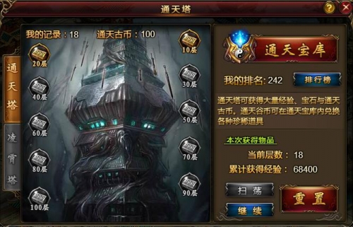 通天塔总共有100层,每天可以免费挑战1次。一天总共能挑战2次,第二次需要消耗通天密钥进入。挑战成功可获得大量经验、宝石通天古币以及珍贵物品等。