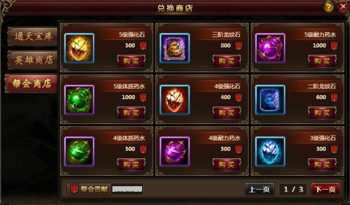 帮会商城:侠士可以用帮贡在帮会商城购买其它商店所没有的珍稀道具。帮贡可以通过捐献铜钱或元宝获得,也可以通过参与帮会仙树以及攻打帮会入侵盗贼获得。帮会商城的等级越高,所出售的道具越珍稀。