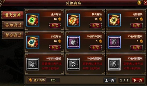 侠士点击”珍宝兑换“即可进入兑换商店。兑换商店包含三大板块:通天宝库、英雄商店和帮会商店。
