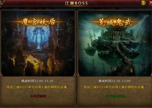 在每天11:00—11:30;21:30—22:30,侠士可进入特定的副本攻打江湖boss。