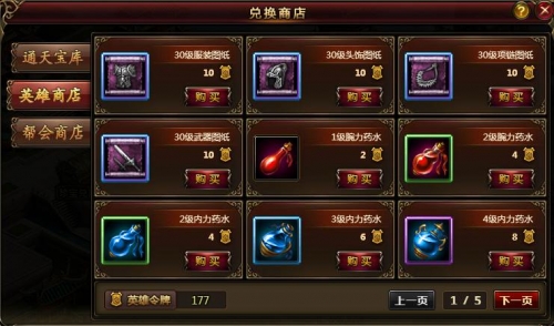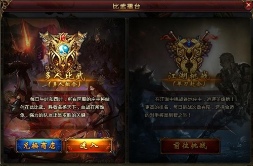 战斗胜利后,玩家将获得大量的声望和英雄令牌作为奖励。英雄令牌积攒到一定数量后可在“竞技商店”兑换各职业的紫色装备图纸及寒铁石、绝版药水等道具。